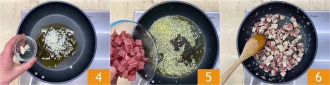 Aqueça o óleo em uma frigideira antiaderente grande, depois adicione a cebola picada e os dentes de alho inteiros 4 e refogue em fogo médio-baixo até que a cebola fique transparente. Neste ponto, retire o alho e adicione os cubos de atum 5. Doure o atum em fogo baixo por 2-3 minutos, tentando virá-lo delicadamente de todos os lados para evitar quebrá-lo 6.