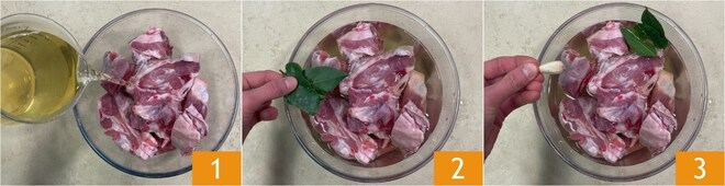 Para preparar o cabrito na panela, primeiro coloque a carne para marinar: coloque os pedaços de cabrito em uma tigela, depois adicione o vinho branco 1, as folhas de louro 2 e o dente de alho esmagado 3.