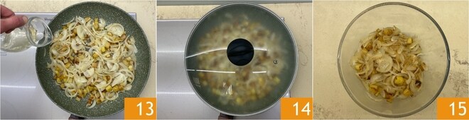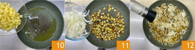Aqueça uma panela grande com um fio de óleo, depois coloque as batatas 10 e doure-as por cerca de dez minutos. Adicione as cebolas 11 e salteie por 3 minutos em fogo médio, em seguida, abaixe o fogo, adicione sal 12 e pimenta.