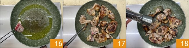 Na mesma panela, aqueça mais um fio de óleo, depois adicione os pedaços de cabrito junto com os aromas da marinada 16 e doure bem todos os lados em fogo alto 17. Adicione sal e pimenta 18.