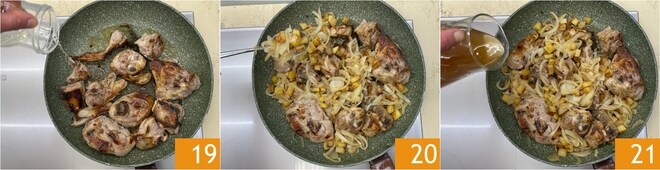 Regue com os restantes 50 g de vinho branco 19, depois adicione as batatas e as cebolas 20 e despeje o caldo de carne 21.