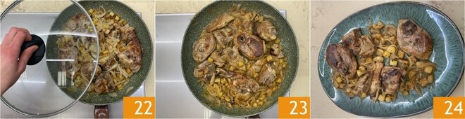 Abaixe o fogo, cubra com a tampa 22 e cozinhe por mais 15 minutos. Após o tempo de cozimento 23, sirva imediatamente o seu cabrito na panela 24!