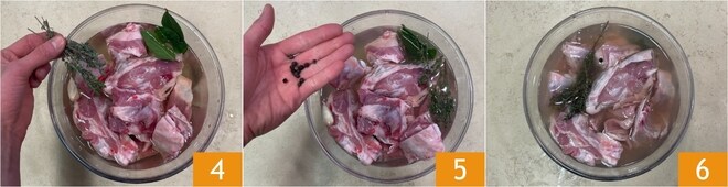 Adicione também os ramos de tomilho 4 e os grãos de pimenta 5. Certifique-se de que a marinada cubra completamente a carne e deixe marinar em temperatura ambiente por pelo menos 2 horas 6. Enquanto isso, prepare o caldo de carne que você usará para cozinhar o cabrito.