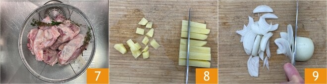 Após esse tempo, escorra a marinada e reserve a carne com os aromas 7. Prepare o restante dos ingredientes: descasque as batatas e corte-as em cubos 8, depois descasque as cebolas e corte-as finamente 9.