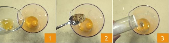 Para preparar a salada Caesar de frango com alface baby, comece preparando o molho. Coloque no copo do mixer as gemas e adicione o vinagre de maçã 1, a mostarda em grãos 2, a pimenta e o sal 3.