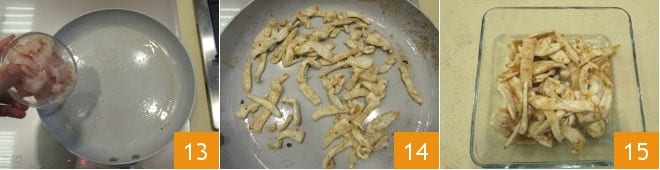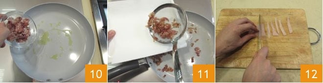 E, sem adicionar mais óleo, coloque-as na frigideira onde dourou o bacon 13. Deixe dourar por alguns minutos 14, depois retire da frigideira e reserve em uma travessa 15.