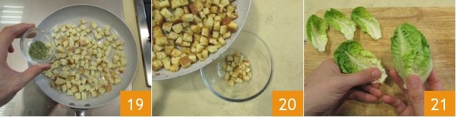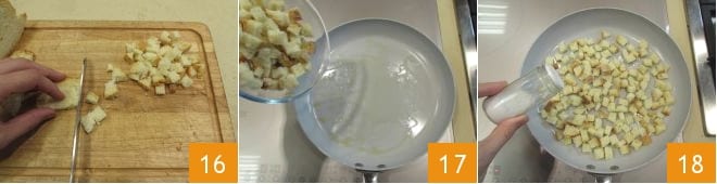 Agora corte o pão em cubinhos 16 (prefira pão congelado, mais fácil de cortar). Adicione um fio de óleo na mesma frigideira e despeje os cubinhos de pão 17. Tempere com pimenta, sal 18