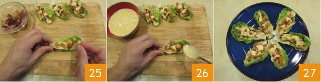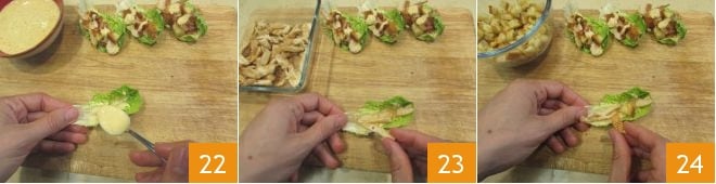 Preencha cada folha com uma generosa dose de molho 22, algumas tiras de frango 23, alguns cubinhos de pão dourado 24