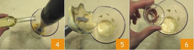 Comece a bater e, ao mesmo tempo, adicione aos poucos o óleo de sementes 4. Quando o molho atingir uma consistência espessa e cremosa 5, adicione as anchovas escorridas do óleo de conservação 6