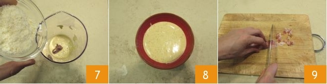 e o queijo parmesão ralado 7. Bata novamente, depois coloque o molho em uma tigela 8 e passe para os outros ingredientes da sua salada Caesar. Corte o bacon em fatias 9