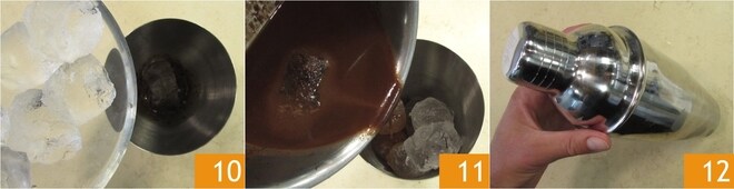 Coloque no shaker o gelo restante 10 e a água com chocolate 11, depois feche e agite energicamente 12.