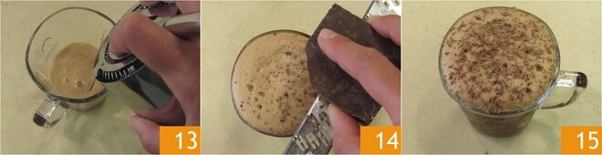 Abra o shaker e, com a ajuda de um strainer, despeje o café em uma xícara transparente 13, depois remova o strainer e deixe cair 2-3 cubos de gelo. Enfeite com chocolate ralado a gosto 14 e aproveite o seu café com chocolate, pimenta e baunilha 15!