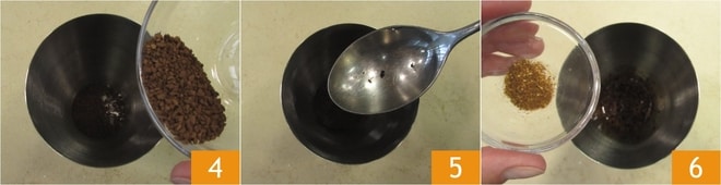 Enquanto isso, coloque o café solúvel no shaker 4 e adicione 2 colheres de sopa da água quente com baunilha 5. Agite bem, depois adicione também a pimenta 6.