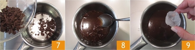 Quando a água atingir a temperatura certa, adicione o chocolate picado grosseiramente 7 e misture bem com uma colher para derretê-lo 8, depois adicione um cubo de gelo 9.