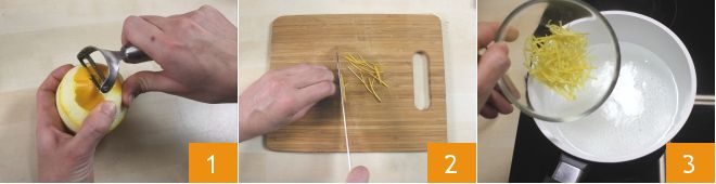 Para preparar o café com laranja e espuma de leite, comece preparando a calda de laranja: com a ajuda de um descascador ou uma faquinha afiada, retire a casca da laranja 1 e corte-a em julienne 2. Ferva a casca em água fervente por 3 vezes, trocando a água a cada vez 3.
