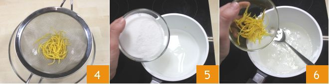 Escorra bem a casca de laranja e reserve 4, enquanto isso coloque em uma panela 140 ml de água, adicione o açúcar 5, deixe dissolver bem e leve para ferver (você deve cozinhar em fogo baixo, mexendo frequentemente para evitar queimar o açúcar). Quando começar a ferver, adicione a casca à calda e continue cozinhando por 5 minutos 6. Após o tempo indicado, desligue o fogo, transfira a calda com a casca para uma tigela e deixe esfriar até atingir a temperatura ambiente.