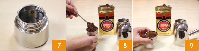 Prepare agora o café utilizando uma cafeteira. Para obter um ótimo café, encha a caldeira da sua cafeteira com água fria e de preferência com pouco calcário, tomando cuidado para não ultrapassar a válvula de segurança 7 (senão você terá um café mais longo). Encha o filtro com café moído formando um montinho 8, que você nivelará batendo o filtro na mesa com movimentos firmes 9. Não pressione com a colher nem faça furos na superfície.