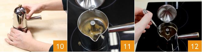 Enrosque bem a cafeteira 10 (para evitar que o café vaze pelos lados enquanto sobe), então coloque-a em uma chama baixa e constante, para obter um café encorpado. À medida que o café sobe, formará uma espuminha densa 11; recomendamos não deixar borbulhar por muito tempo, para manter intactos o aroma e a doçura. O seu café está pronto: antes de servi-lo, mexa diretamente na moka com uma colher, para torná-lo mais homogêneo 12.
