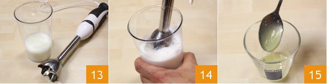 Em um recipiente alto e estreito, despeje o leite 13, rigorosamente frio, e bata-o usando um mixer de imersão, trabalhando apenas na superfície 14. Em quatro copos médios de vidro, despeje 20 ml de calda de laranja em cada um, adicionando alguns pedacinhos de casca 15.