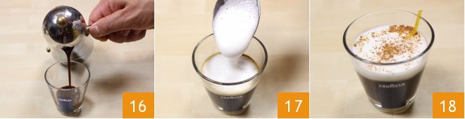 Despeje o café quente (uma xícara, cerca de 40 ml) na calda de cada copo 16 e finalize adicionando 2-3 colheres de creme de leite frio na superfície 17. Decore finalmente o café com laranja e espuma de leite com uma leve pitada de canela em pó 18 e saboreie na hora.