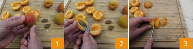 Para preparar o bolo de damascos, comece pela fruta. Escolha damascos doces, maduros, mas com a polpa firme. Lave-os delicadamente em água corrente 1. Separe 5 damascos inteiros, que serão usados para a decoração final, e com a ajuda de uma faca, divida os outros damascos ao meio 2, retire o caroço central e, sem descascá-los, corte-os em cubos de aproximadamente 1,5 cm 3 e reserve-os.