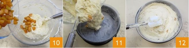 Adicione à massa também os pedaços de damasco 10 e misture até incorporar tudo. Transfira a mistura para uma forma de 24 cm de diâmetro, previamente untada e forrada com papel manteiga 11 e nivele a superfície com uma espátula 12.