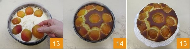 Recupere os damascos reservados, corte-os ao meio, retire o caroço e coloque-os delicadamente sobre a superfície do bolo com a parte côncava voltada para baixo 13. Asse em forno estático pré-aquecido a 180° por cerca de 60 minutos (se usar forno ventilado, asse a 160° por cerca de 40 minutos) 14. Para garantir que o bolo esteja realmente assado, espete um palito de churrasco no centro: se sair seco, seu bolo de damascos está pronto. Depois de retirar do forno, deixe o doce esfriar antes de desenformá-lo, então coloque-o sobre uma grade para esfriar completamente, depois em um prato de servir 15. Se preferir, pode polvilhar seu bolo de damascos com açúcar de confeiteiro e servir.