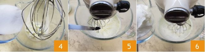 Adicione os ovos inteiros e a gema, um de cada vez, e deixe-os incorporar à massa 7, então bata por alguns minutos e desligue a máquina. Peneire a farinha, misturada com o fermento, diretamente na tigela 8 e misture com um batedor manual 9, tomando cuidado para não desmontar muito a mistura. Adicione também o sal neste ponto.