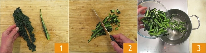 Para preparar a calamarata com couve negra e 'nduja, comece limpando a couve. Separe os talos das folhas 1 e corte-os em pedaços 2. Mergulhe-os em água fervente, salgada a gosto, que servirá para o cozimento da massa 3.