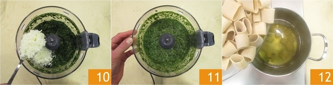 Adicione também um pouco de água do cozimento, o Pecorino ralado 10 e bata novamente até obter um creme liso 11. Cozinhe a massa 12 e deixe-a al dente.