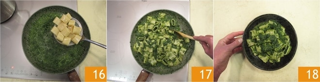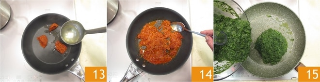 Enquanto isso, em uma panelinha, adicione a 'nduja, acrescente um pouco da água do cozimento da massa 13 para facilitar o derretimento 14. Transfira o creme de couve negra para uma frigideira grande 15.