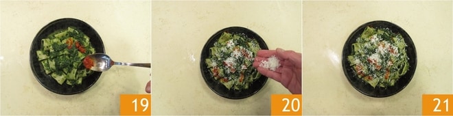 Adicione por cima alguns montinhos de 'nduja 19 e finalize com mais Pecorino ralado 20. A massa está pronta, agora é só servir 21.