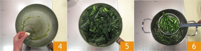 Enquanto isso, em uma frigideira, doure um dente de alho com um fio de azeite 4 e adicione as folhas de couve negra. Cozinhe por cerca de 20 minutos 5, adicionando a água do cozimento dos talos conforme necessário e cobrindo com uma tampa. Assim que os talos estiverem macios, escorra-os com uma escumadeira 6, mantendo a água quente.