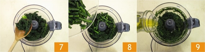Transfira as folhas de couve para um processador de alimentos 7, adicione os talos 8 e bata até reduzir a um creme. Adicione um bom fio de azeite 9.