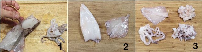 Para preparar as lulas recheadas à andaluza, comece limpando as lulas: pegue as lulas, esvazie a bolsa, retire o osso e a membrana que reveste a bolsa, separe os tentáculos e retire o bico 1. Separe as barbatanas laterais do corpo 2 e pique-as finamente junto com os tentáculos 3, reserve as bolsas limpas das lulas. Para ver o guia da escola de culinária sobre como limpar lulas em detalhes, clique aqui.