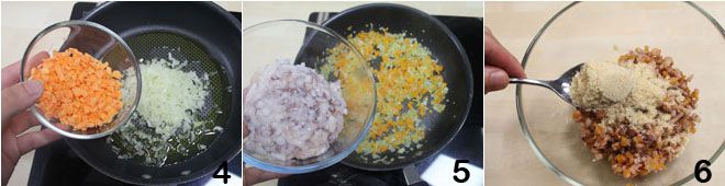 Em seguida, dedique-se à preparação de um Ovos cozidos, uma vez pronto, descasque e deixe esfriar. Agora prepare o recheio: descasque e pique finamente uma cebola e uma cenoura, depois refogue metade da cebola com 3 colheres de sopa de azeite extravirgem e, quando estiver murcha, adicione também metade da cenoura 4. Deixe cozinhar por 5 minutos em fogo médio, depois adicione o picado de lulas 5. Cozinhe por mais 5 minutos, então retire do fogo e coloque o recheio em uma tigela grande com o pão ralado 6.