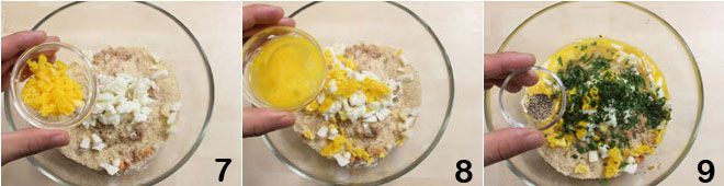 Neste ponto, pegue o ovo cozido e separe a gema da clara. Esfarele a gema e pique a clara, depois bata em uma tigelinha o segundo ovo, ajudando-se com um garfo, e por fim pique finamente um punhado de salsa. Adicione à mistura de lulas o pão ralado, o ovo cozido 7, o ovo batido 8, a salsa e ajuste o sal e a pimenta 9.