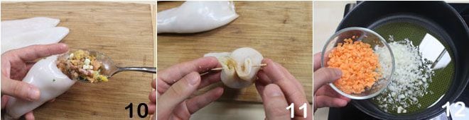 Misture bem todos os ingredientes e comece a montar as lulas: encha a bolsa com um par de colheres de recheio 10 e feche as lulas com um palito de dente, como mostra a foto 11. Neste ponto, prepare o molho: refogue a cenoura e a cebola restantes com 3 colheres de sopa de azeite extravirgem 12.