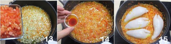 Lave, limpe e corte os tomates em cubos e depois adicione-os ao refogado 13. Adicione neste ponto o açafrão dissolvido em uma colher de água 14, em seguida, as lulas recheadas 15. Cubra com uma tampa e continue cozinhando em fogo baixo por 30 minutos, mexendo a panela de vez em quando para evitar que grudem no fundo. Quando as lulas à andaluza estiverem cozidas, coloque-as em um prato de servir, corte em fatias e cubra com o molho de tomate.