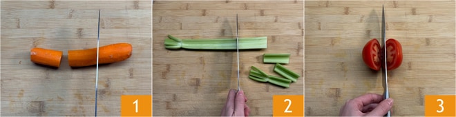 Para preparar o caldo de legumes, a primeira coisa a fazer é lavar e limpar os legumes. Corte a cenoura 1 e o aipo 2 em pedaços. Divida os tomates ao meio 3.
