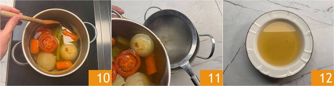Leve à fervura 10 e deixe ferver sem tampa, ou com a tampa ligeiramente deslocada, por cerca de uma hora. Experimente e, se necessário, ajuste o sal. Depois do tempo de cozimento, coe o caldo através de uma peneira 11. O caldo de legumes está pronto para ser usado nas suas receitas 12!
