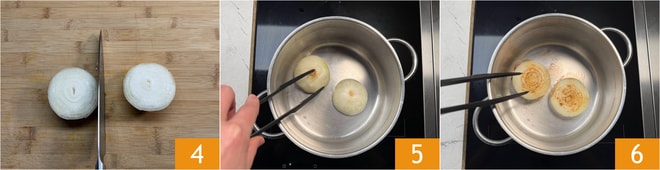Faça o mesmo com a cebola 4 e coloque-a na panela com a parte cortada voltada para baixo 5. Acenda o fogo e toste a cebola por cerca de 1 minuto e meio, tomando cuidado para não queimá-la. Depois vire para o outro lado e toste por mais um minuto 6.