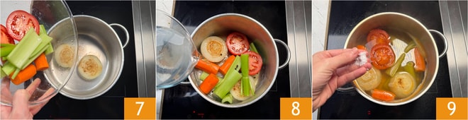 Adicione os outros legumes 7, depois despeje um pouco de água para deglaçar o fundo 8. Neste ponto cubra com o restante da água e tempere com os grãos de pimenta e o sal 9.