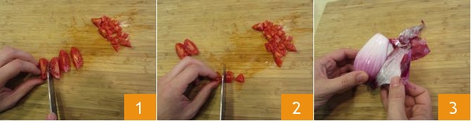 Para preparar a sopa de tomate, a primeira coisa é lavar os tomates. Em seguida, corte-os primeiro em 4 1 e depois em cubos bem pequenos 2. Reserve e passe para a cebolinha Tropea; retire as folhas mais externas 3