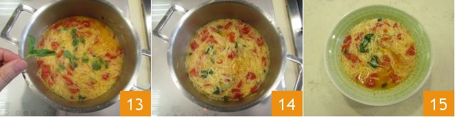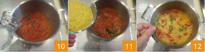 Adicione 200 g de água 10 e cozinhe por cerca de 15 minutos. Depois, despeje mais 500 g de água e leve à fervura, em seguida, adicione a massa diretamente dentro da sopa de tomate 11 e finalize o cozimento da massa. Se escolher um formato como o nosso, bastarão apenas 2 minutos de cozimento. Perfume com algumas folhinhas de orégano fresco 12,