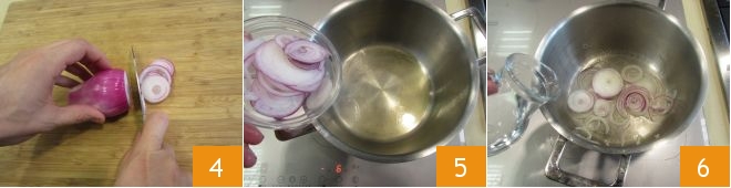 e corte em fatias 4. Aqueça um fio de azeite em uma panela, adicione a cebolinha 5 e 50 g de água 6. Deixe as cebolas refogarem em fogo moderado por cerca de dez minutos,