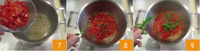 depois adicione também os tomates 7, as folhinhas de orégano fresco 8, as de manjericão 9 e tempere com sal e pimenta.