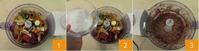 Para preparar o caldo de legumes, pegue todas as sobras dos seus vegetais 1. Você pode usar qualquer tipo e qualquer parte comestível de cada vegetal. Você deverá obter um total de 760 gramas de sobras incluindo cascas, extremidades dos vegetais, pedaços etc. Transfira-as para o recipiente de um mixer 1, adicione o sal grosso 2 e processe tudo até obter um purê 3.