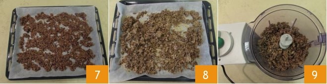 Espalhe sobre a assadeira, distribuindo uniformemente 10 e asse em forno estático pré-aquecido a 120°C por cerca de 2 horas e meia. Quando os vegetais estiverem bem secos, retire do forno 11, deixe esfriar e transfira novamente para o mixer limpo 12.