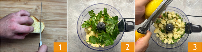 Para preparar os camarões gratinados, primeiro corte a crosta do pão de sêmola 1 para obter o miolo. Corte em cubos e coloque em um processador, adicione a salsa 2, as raspas de limão 3 e bata por 1 minuto.